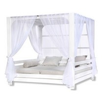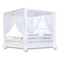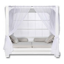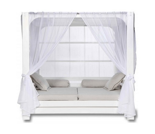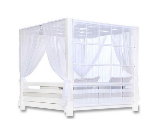 Беседка сверху и с одной из сторон прикрыта полупрозрачным тентом. С трех других сторон находится полупрозрачная сетка, при опускании которой кровать оказывается под легким балдахином