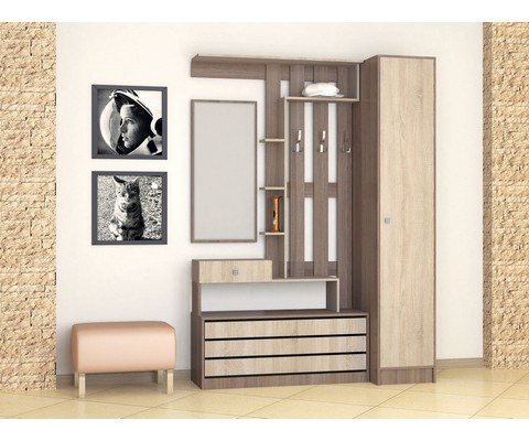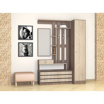 Модуль состоит из тумбы, вешалки для верхней одежды, полки для головных уборов, стеллажа и зеркала.