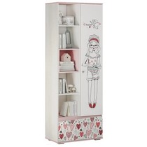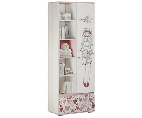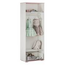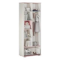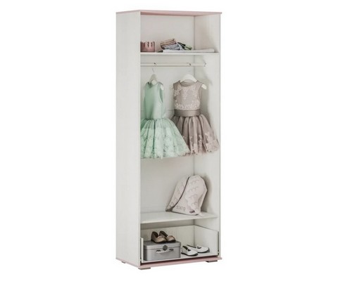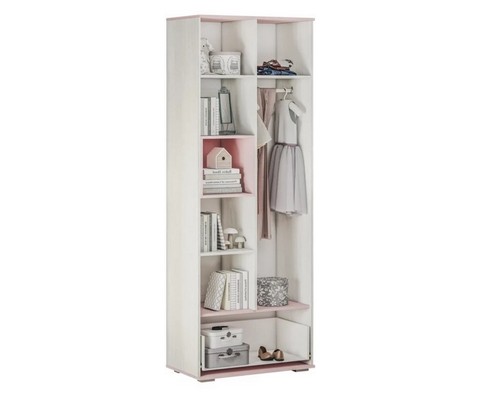 Шкаф с открытыми полками оснащен секцией с полками, выдвижным ящиком, секцией с дверкой, за которой находится штанга для вешалок, полка.