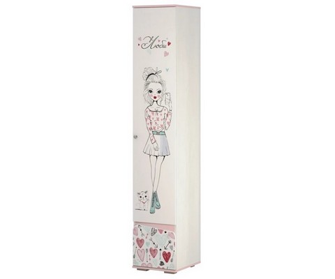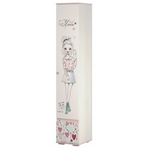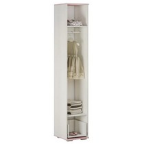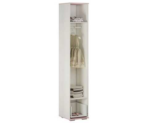Пенал с закрытыми полками оснащен штангой для вешалок, полками и выдвижным ящиком.