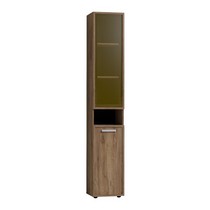 Верхний рамочный фасад шкафа МЦН (82) с тонированным стеклом открывается за раму, нижний фасад - за серую ручку из массива дерева.