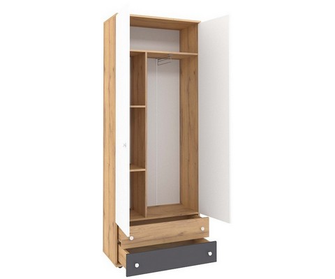 Шкаф для одежды и белья (92) оснащен двумя выдвижными ящиками, стеллажом для одежды и выдвижной штангой для вешалок.