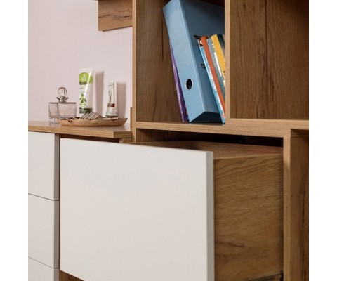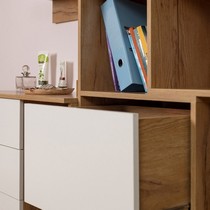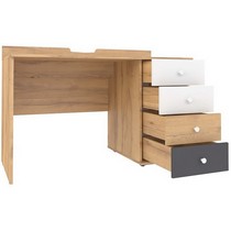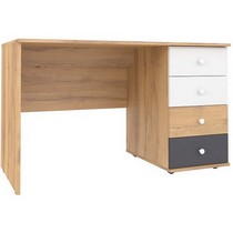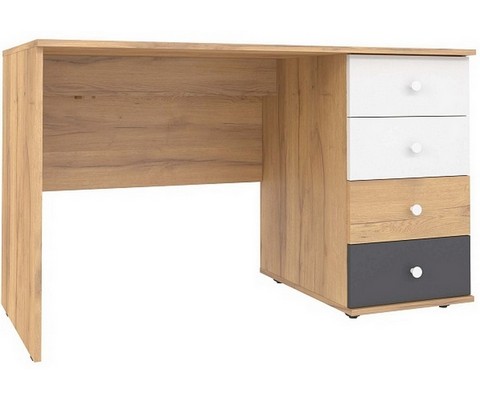 Письменный стол оснащен тумбой с четырьмя выдвижными ящиками, откидной частью на столешнице, которая открывается за плавный вырез.