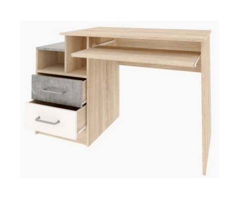Стол оснащён тумбой с двумя выдвижными ящиками, двумя открытыми нишами-полками (над тумбой) и выдвижной полкой для клавиатуры.