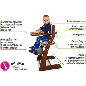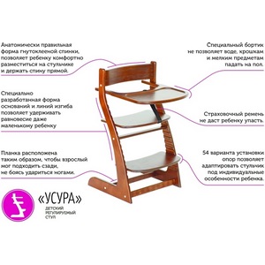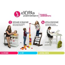 Стул Усура «растет» вместе с вашим ребенком: у него легко регулируется высота сидения и подножки, кроме того имеется съемный столик для кормления (докупается отдельно).
