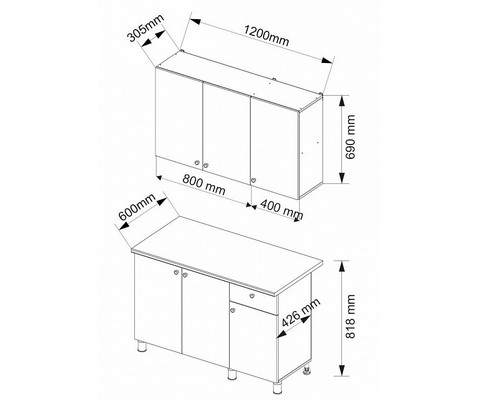 Дополнительные параметры: высота верхних тумб - 690 мм глубина верхних тумб - 305 мм высота нижних тумб - 818 мм глубина нижних тумб - 426 мм толщина столешницы - 28 мм глубина столешницы - 600 мм.
