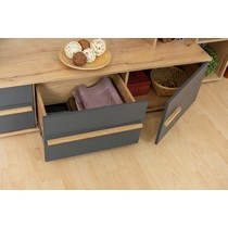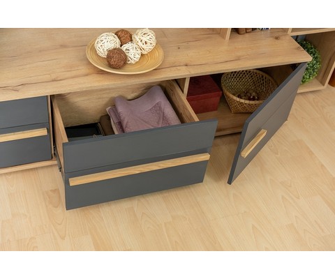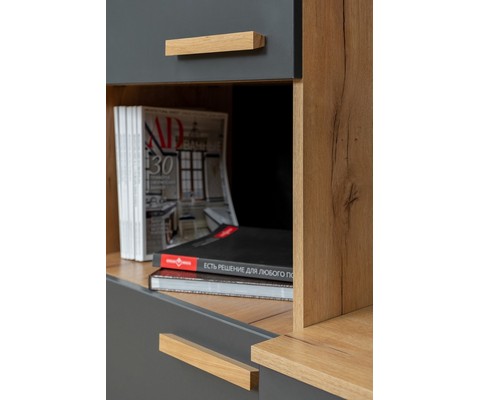 Тумба под ТВ имеет две закрытые ниши и выдвижной ящик на надежных направляющих.