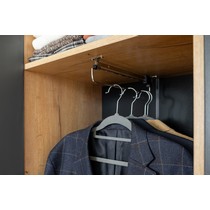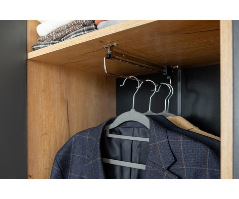 Шкаф для одежды и белья оснащен набором полок и штангой для вешалок.