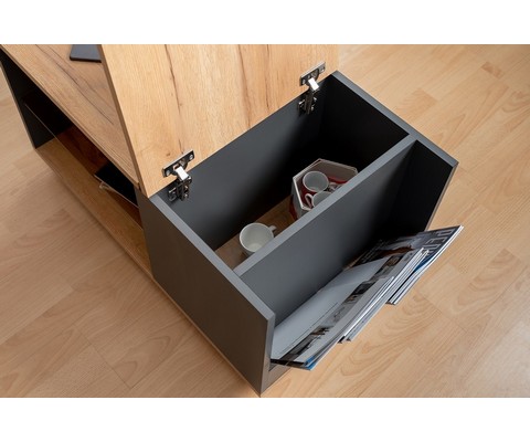 Тумба под ТВ имеет две закрытые ниши и выдвижной ящик на надежных направляющих.