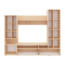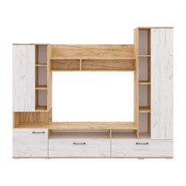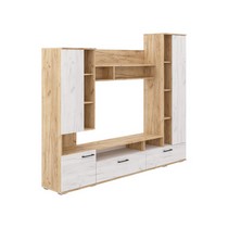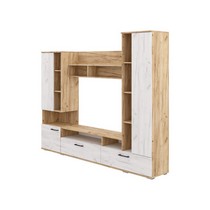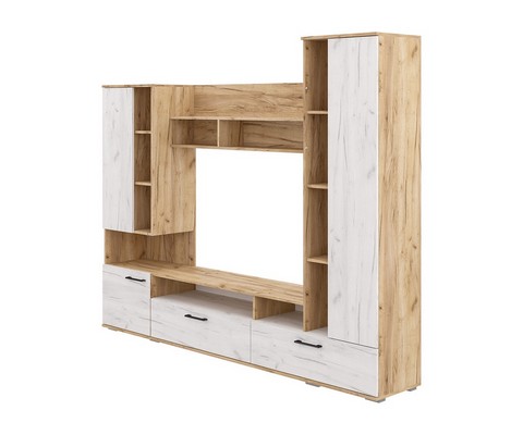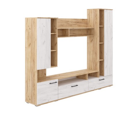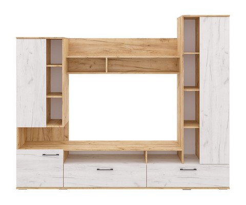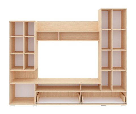 Комплектация гостиной Калипсо: стеллаж с нишей и 3 полками, распашной шкафчик без ручек на 3 полки, тумба под ТВ с надстройкой, место под телевизор 92х120 см, 2 открытые ниши, 2 выдвижных ящика, распашной шкафчик, шкаф распашной на 4 вместительные полки, 4 открытые полки, надстройка с 3 полками.