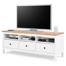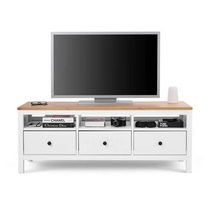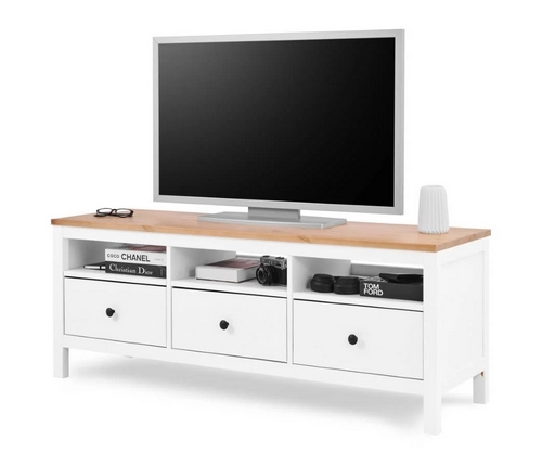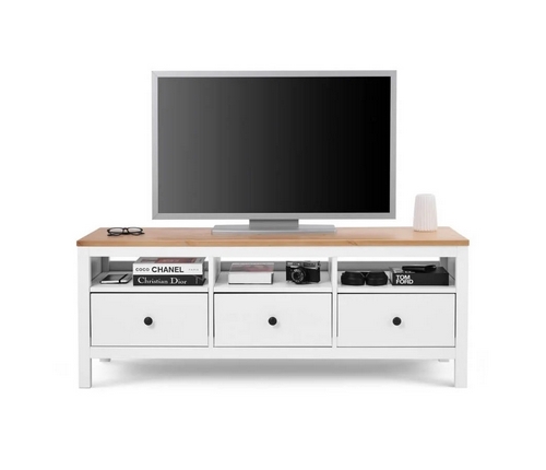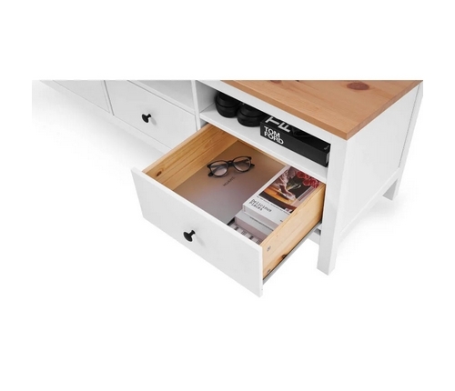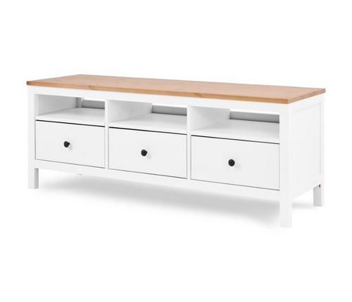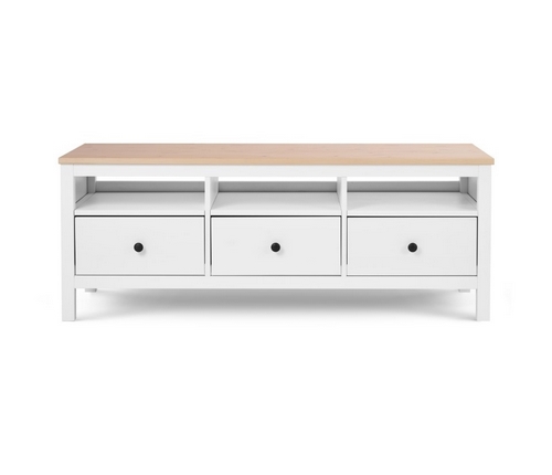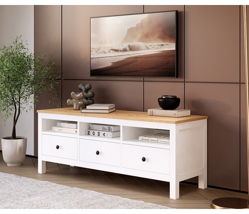 ТВ-тумба Кымор оснащена тремя вместительными выдвижными ящиками с черными ручками-кнопками.