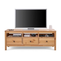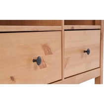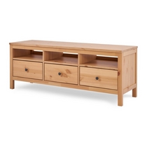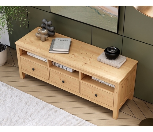ТВ-тумба Кымор оснащена тремя вместительными выдвижными ящиками с черными ручками-кнопками.