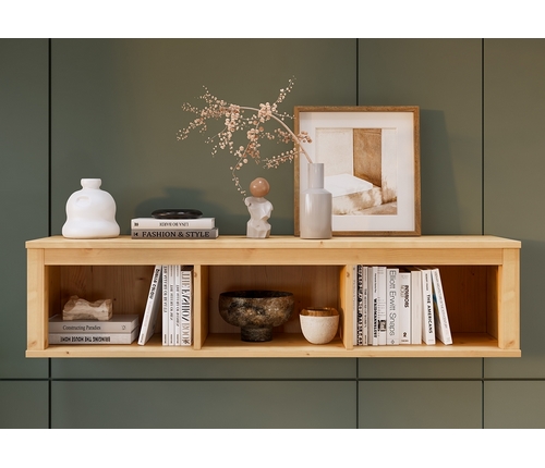 Навесная полка Кымор состоит из трех открытых секций, что позволяет удобно разместить книги, фотографии, декоративные элементы и другие предметы.
