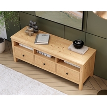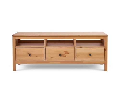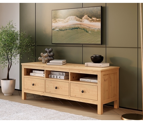 ТВ-тумба Кымор оснащена тремя вместительными выдвижными ящиками с черными ручками-кнопками.