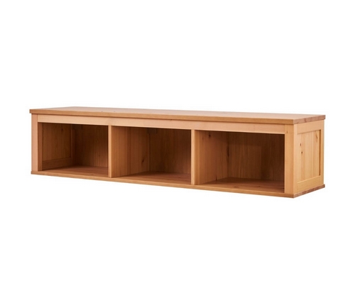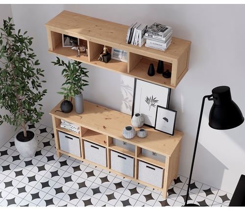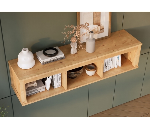 Навесная полка Кымор состоит из трех открытых секций, что позволяет удобно разместить книги, фотографии, декоративные элементы и другие предметы.