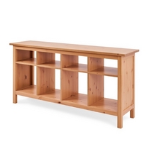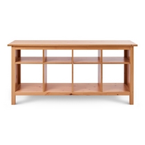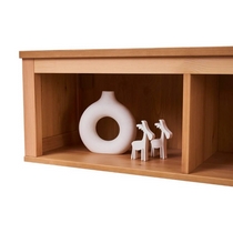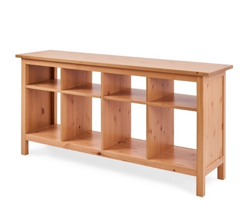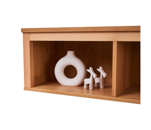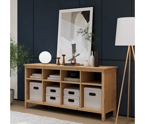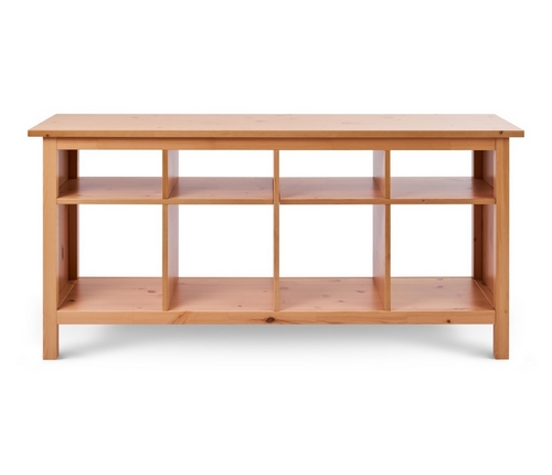Восемь открытых секций под столешницей, разделенные на два ряда разной высоты, создают удобное пространство для хранения и демонстрации вещей.