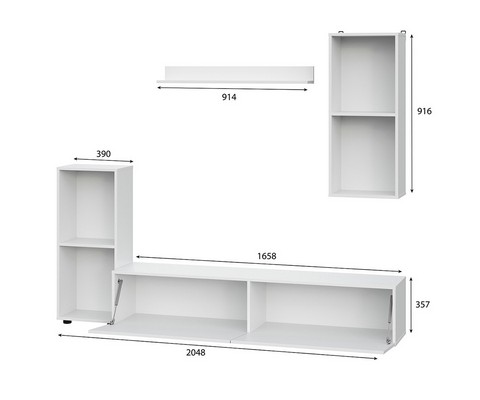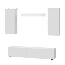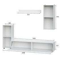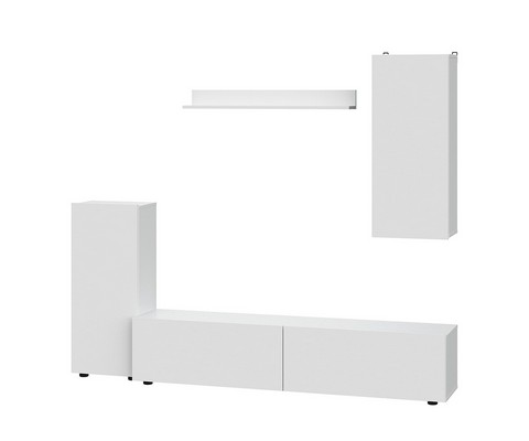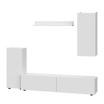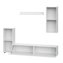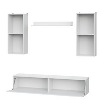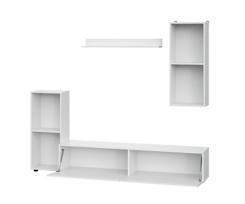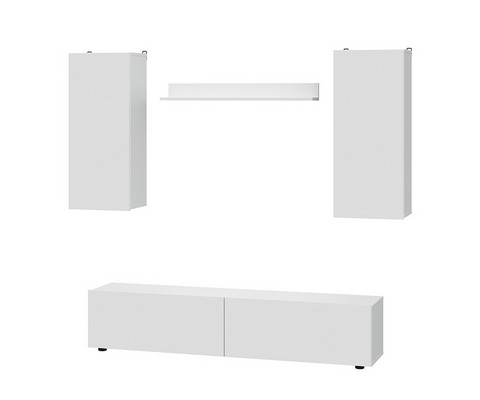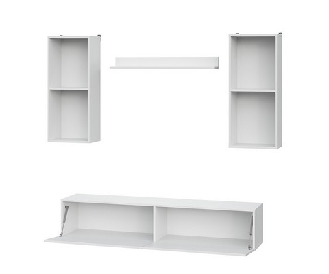 Комплект состоит из тумбы под ТВ, двух пеналов и навесной полки.