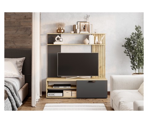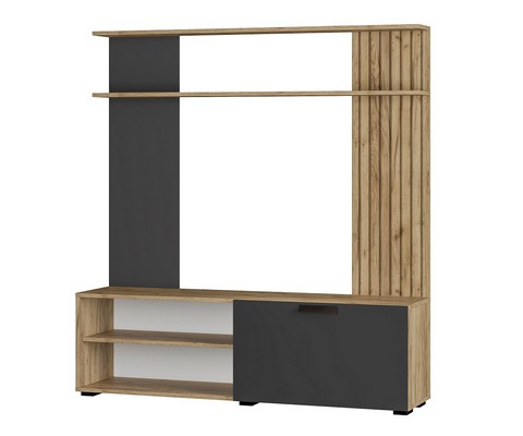 Стенка с полкой под ТВ 1 ГС-05 состоит из тумбы под ТВ с открытыми полками и шкафчиком с глухим откидным фасадом и двух навесных полок.