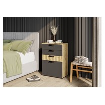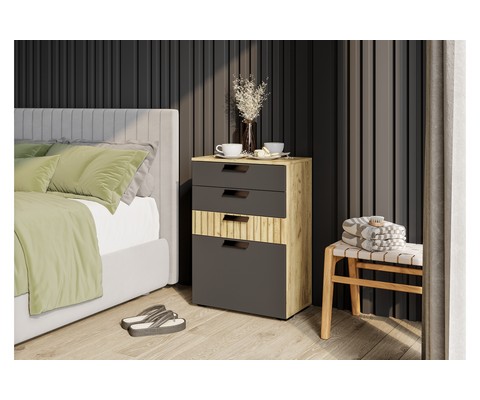Гостиная Мишель комплект 1 - выполнена из высококачественного ЛДСП в цвете крафт с фасадами в глубоком оттенке графит и фотопечатью, имитирующей деревянные рейки.