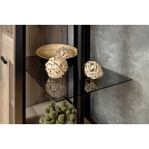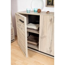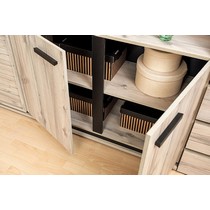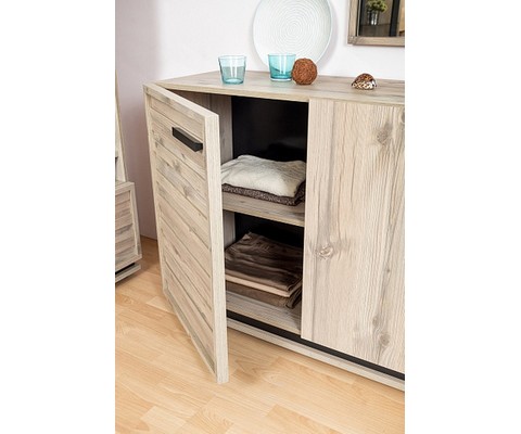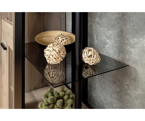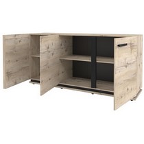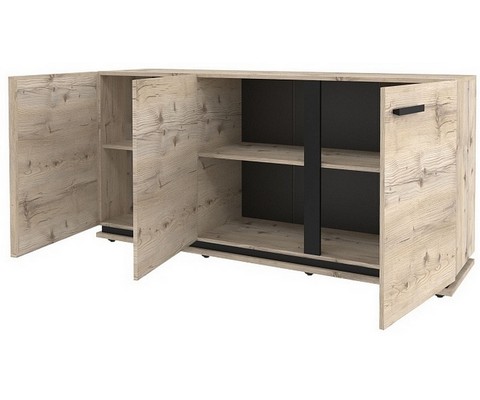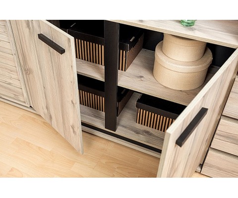 Шкаф оснащен открытыми полками и двумя закрытыми отсеками, полки можно регулировать по высоте.