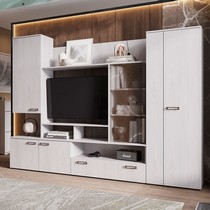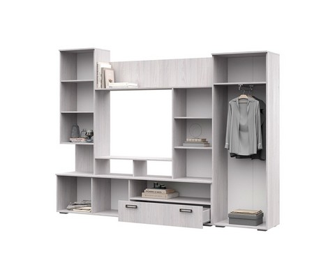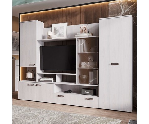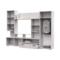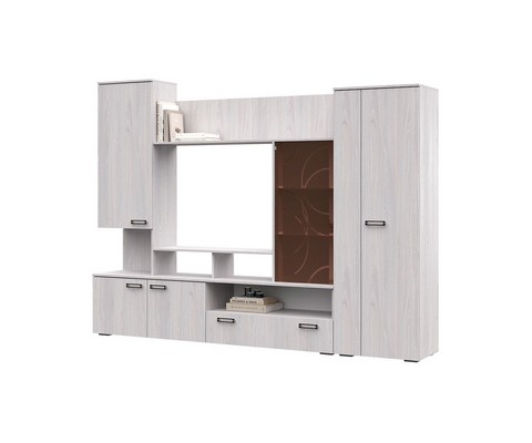 Гостиная Сиена включает в себя сервант для посуды, шкаф с полками закрытый, тумбу для телевизора и шкаф платяной с полкой и штангой.