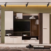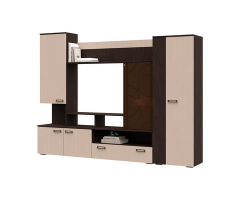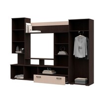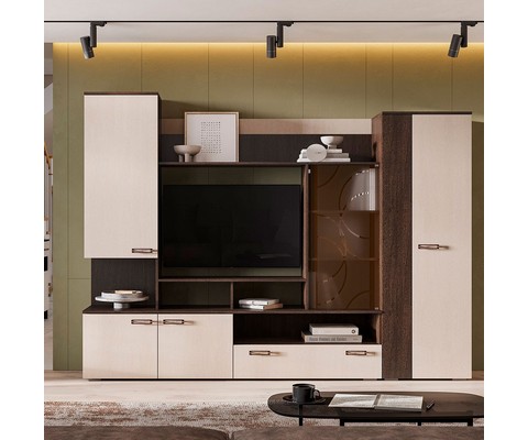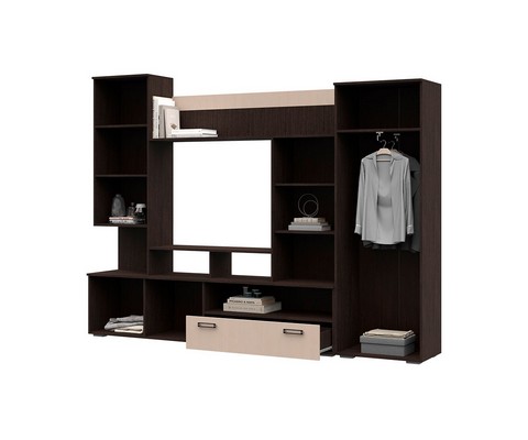 Гостиная Сиена включает в себя сервант для посуды, шкаф с полками закрытый, тумбу для телевизора и шкаф платяной с полкой и штангой.