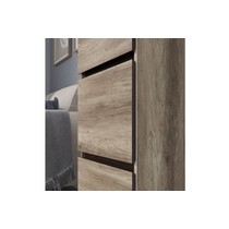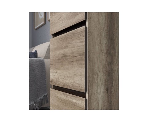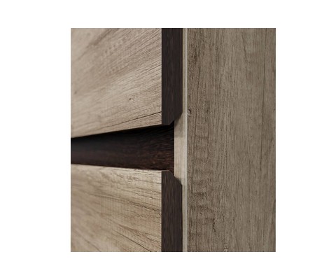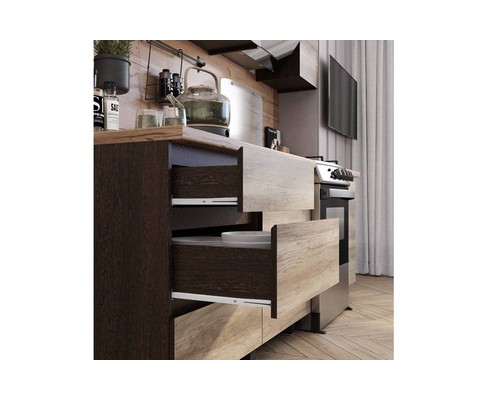 Выдвижные ящики оснащены роликовыми направляющими 450 мм и открываются за счет среза на фасадах, которые обеспечивают удобный захват, а также придают гарнитуру монолитный вид.