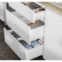 Кухонный гарнитур не имеет ручек, их роль выполняют скосы под 45 градусов на нижних модулях и выступы на фасадах навесных шкафов.