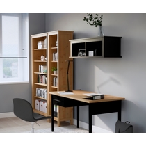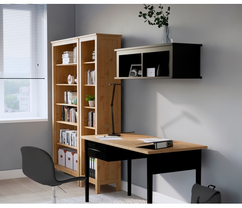 Комплект включает стеллажи Кымор шириной 49 и 90 см, навесную полку Кымор и письменный стол Вухтым с ящиками.