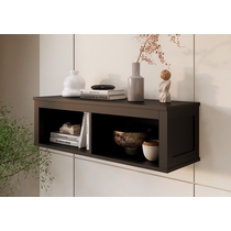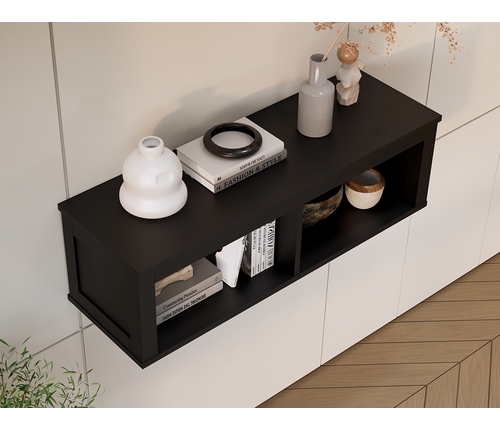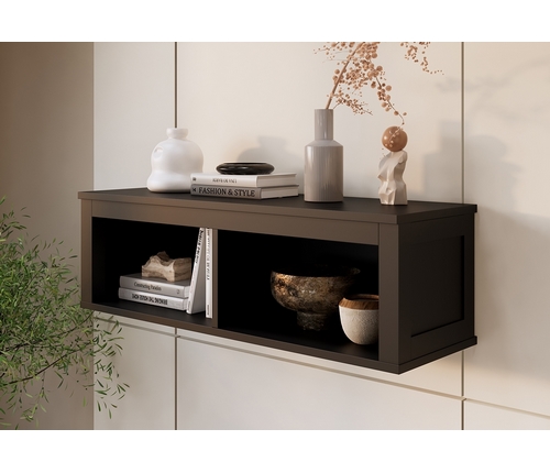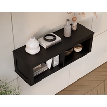 Навесная полка Кымор, состоящая из двух отделений, может быть установлена между стеллажами или шкафами, прикрепленными к стене, или же закреплена отдельно.