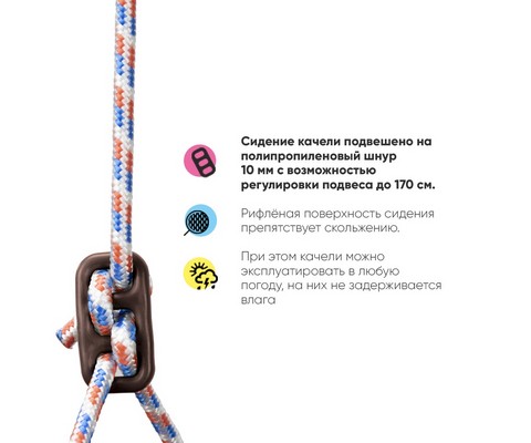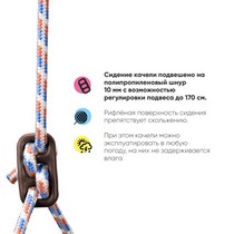 Качели подвешены на полипропиленовый шнур 10мм, с возможностью регулировки подвеса до 170 см.