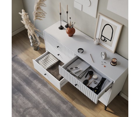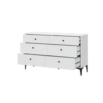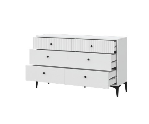 Комод MOON КМ-3.1 оснащен шестью вместительными выдвижными ящиками, что обеспечивает удобное разделение пространства для хранения различных категорий вещей.