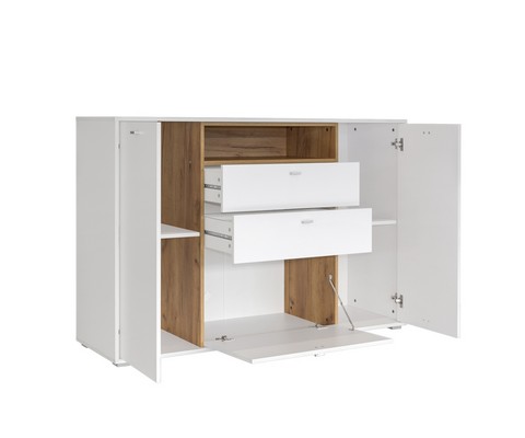 Комод включает два боковых отсека с дверцами, а по центру - открытую нишу, два выдвижных ящика и отсек с откидной дверцей.