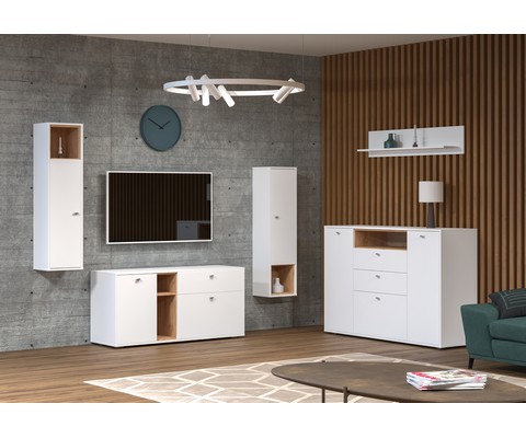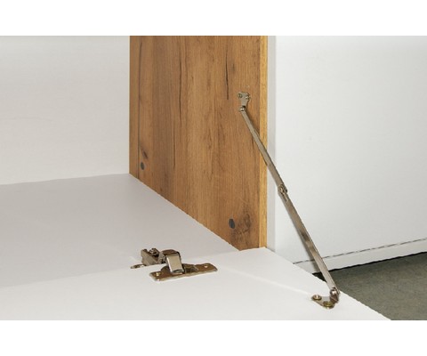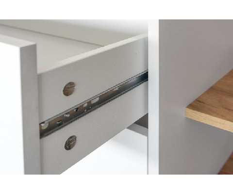Корпус и фасады комода выполнены в цвете белый премиум, а открытая ниша и внутренние две стенки - в оттенке дуб крафт золотой.
