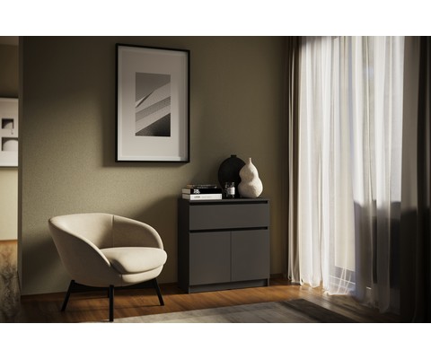 Комод Челси 800 1 ящик 2 двери (графит) в современном дизайне. Вместительные ящики и полки позволят организовать место хранения всех необходимых предметов.