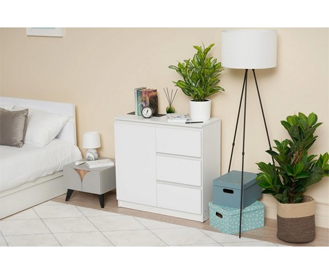 Комод Челси 800 3 ящика 1 дверь (белый глянец холодный, белый) в современном дизайне. Вместительные ящики и полки позволят организовать место хранения всех необходимых предметов.