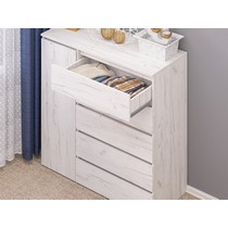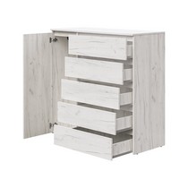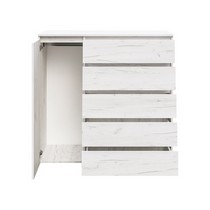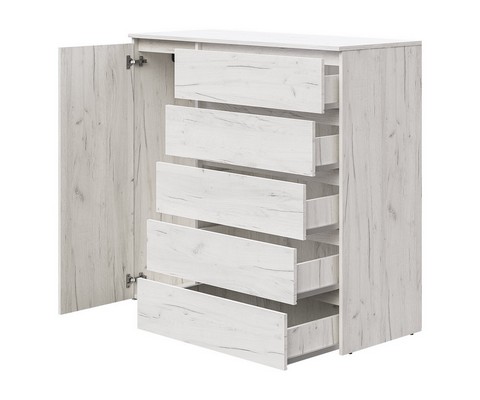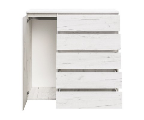 Оснащение конструкции: пять выдвижных ящика бесшумного плавного хода, распашной шкафчик с вешалкой для одежды.