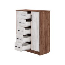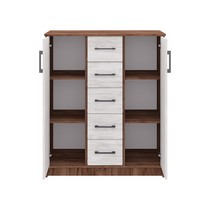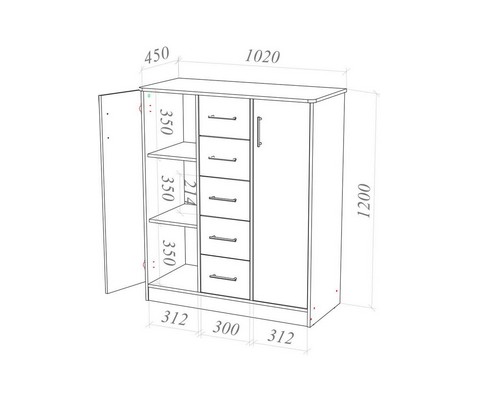Конструкция оборудована пятью ящиками полного выдвижения на направляющих бесшумного плавного хода, в правой и левой частях, за распашными глухими дверцами, шесть вместительных ниш - по три с каждой стороны.