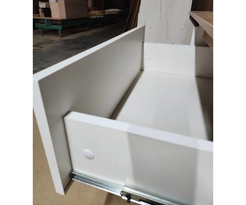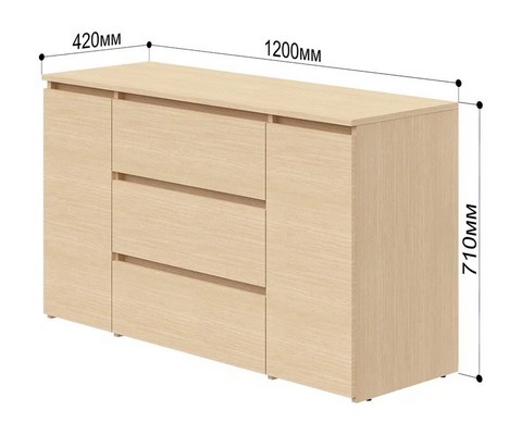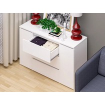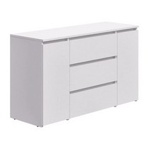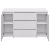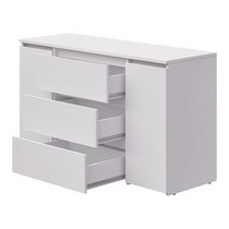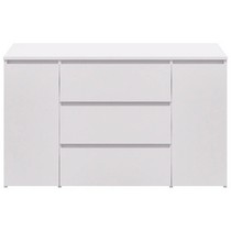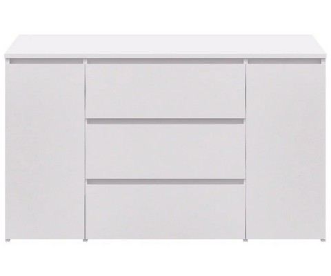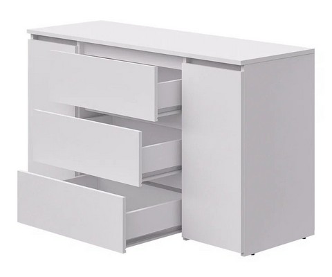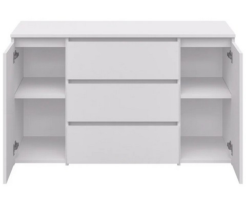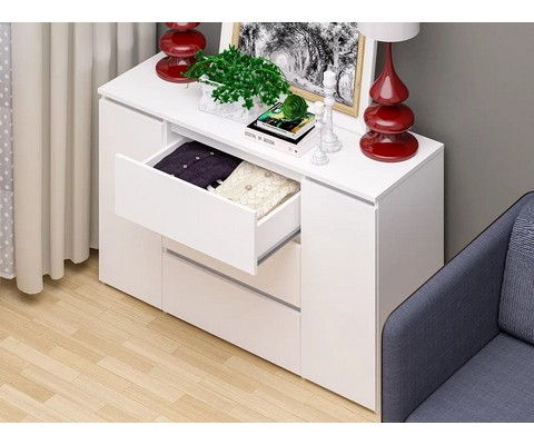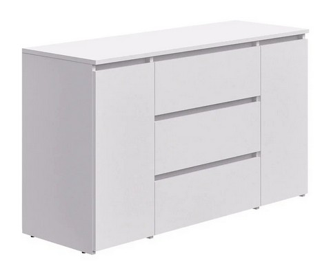 Комод К-32 белый оснащен 3 выдвижными ящиками и 2 распашными дверцами.
