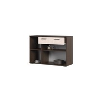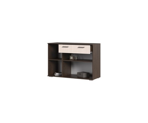 Комод разделен на три секции: горизонтальный выдвижной ящик, полки под ним за двумя распашными дверцами и закрытое одностворчатое отделение. .
