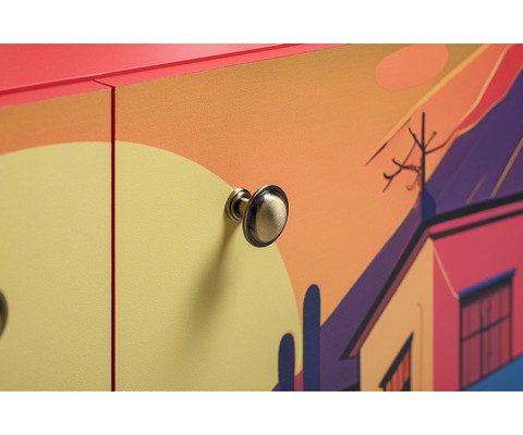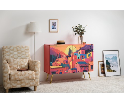 Фасады комода украшены живописным городским пейзажем, создающим атмосферу уюта и индивидуальности.