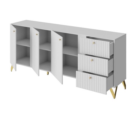 Комод объединяет три выдвижных ящика и три распашные дверцы, за которыми скрывается удобное внутреннее пространство с полками.