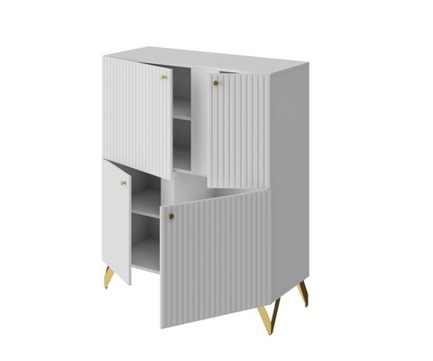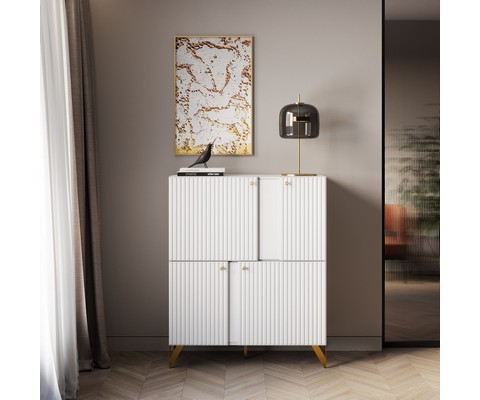 Комод объединяет четыре распашные дверцы, за которыми скрывается удобное внутреннее пространство с полками.