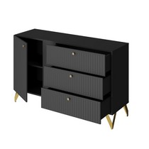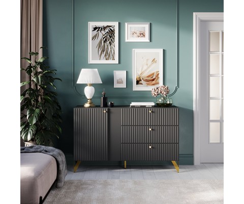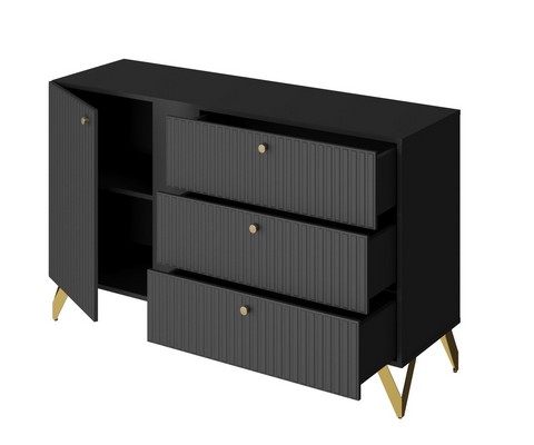 Комод объединяет три выдвижных ящика и одну распашную дверцу, за которой скрывается удобное внутреннее пространство с полками.