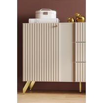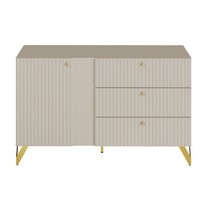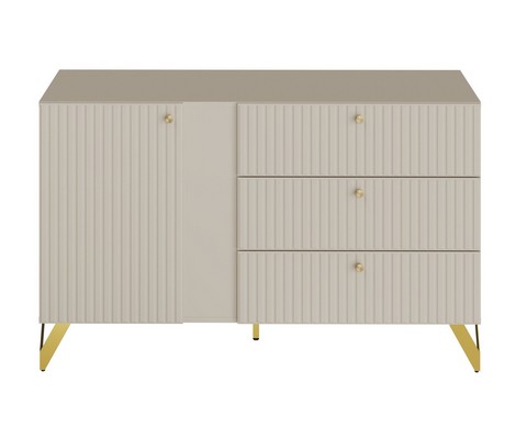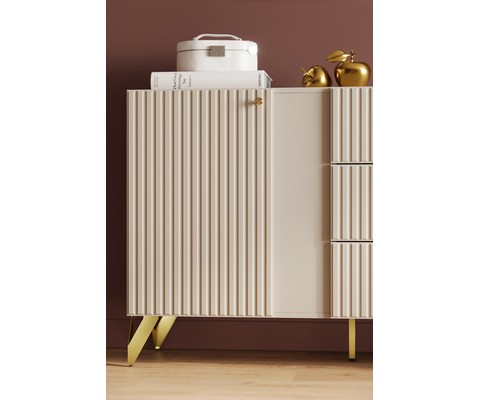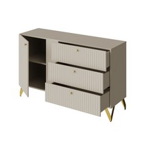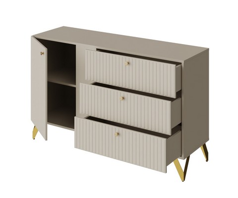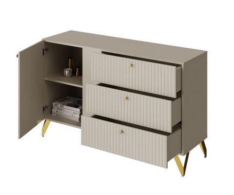 Комод объединяет три выдвижных ящика и одну распашную дверцу, за которой скрывается удобное внутреннее пространство с полками.