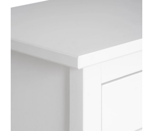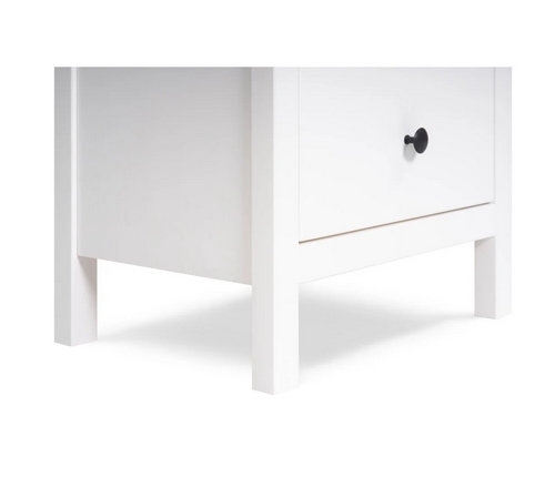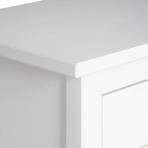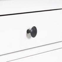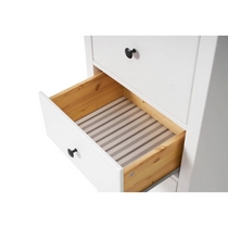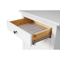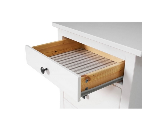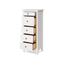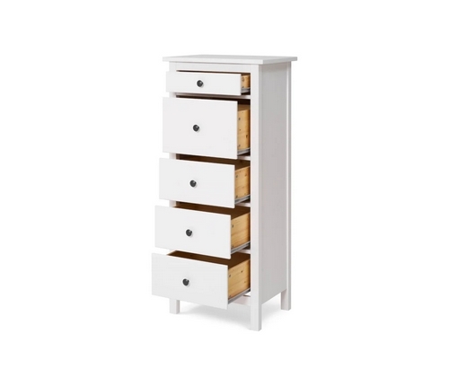 Комод оснащен пятью выдвижными ящиками на роликовых направляющих, внутренние поверхности которых не окрашены для сохранения естественного вида древесины.