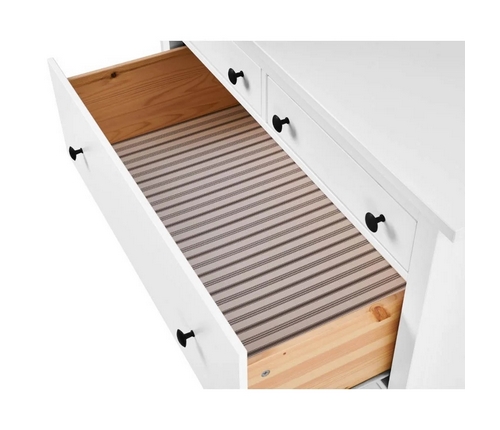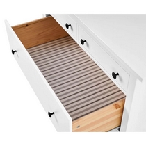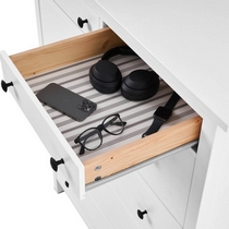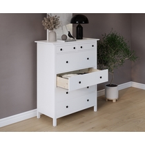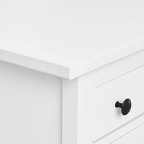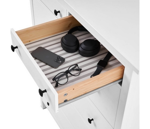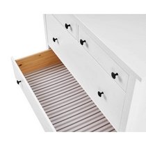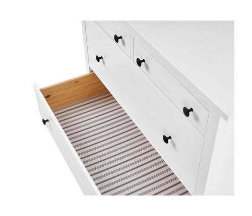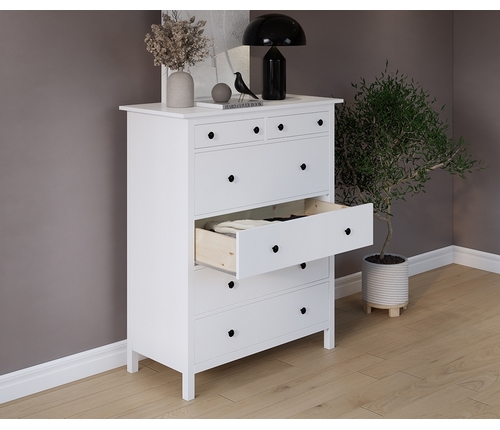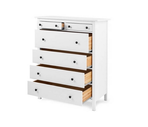 Комод оснащен двумя верхними маленькими и четырьмя вместительными выдвижными ящиками.
