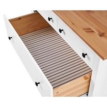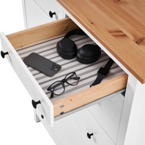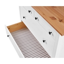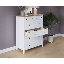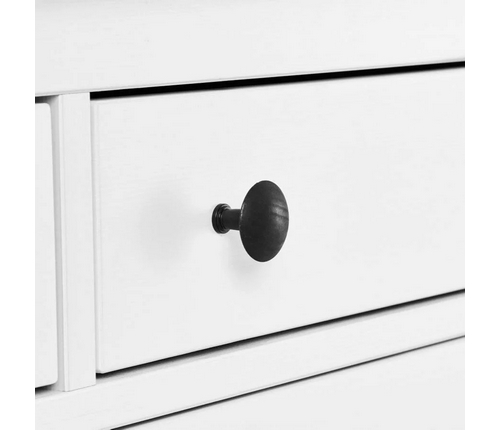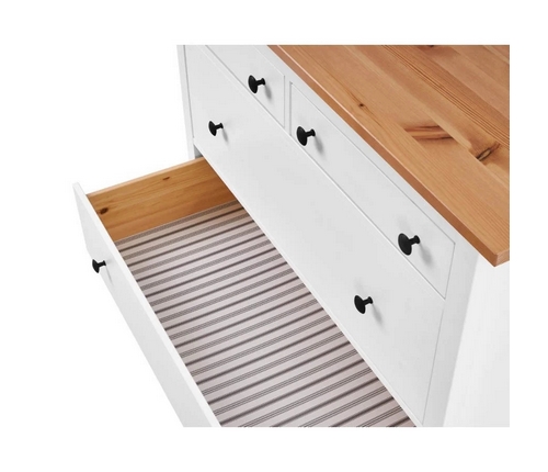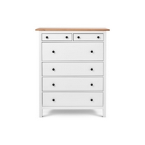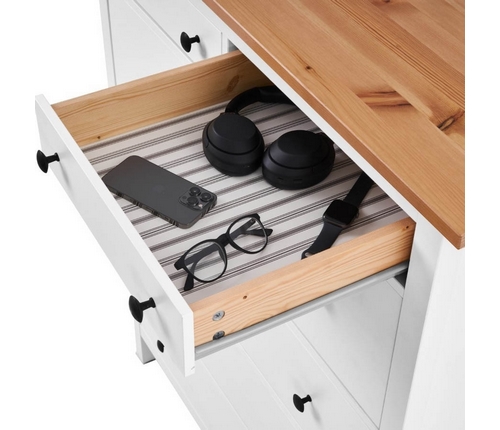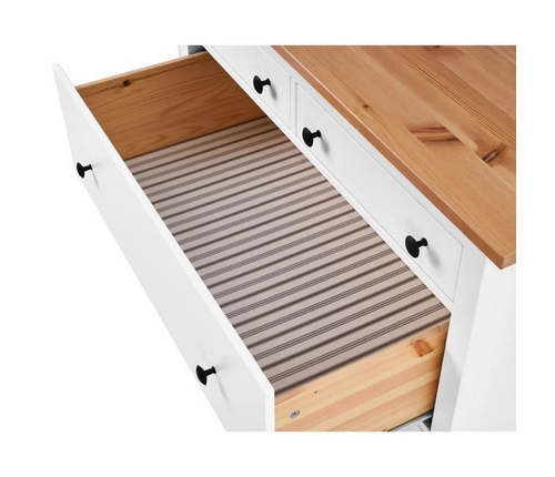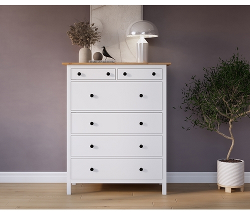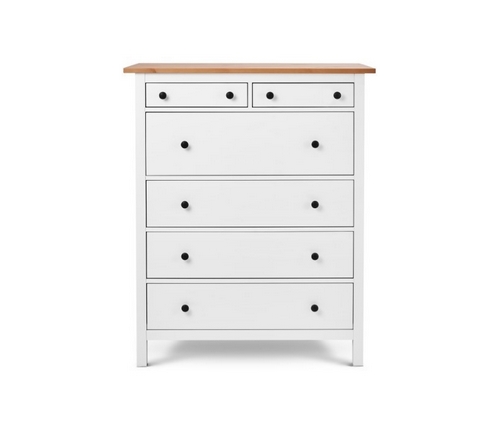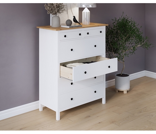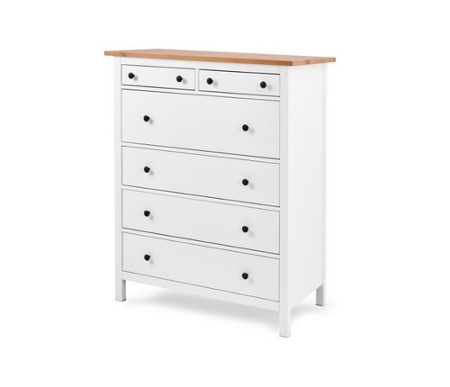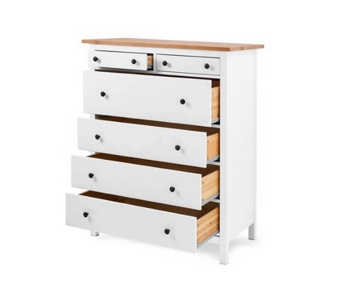 Комод оснащен двумя верхними маленькими и четырьмя вместительными выдвижными ящиками.