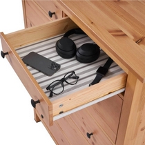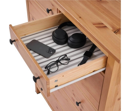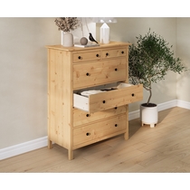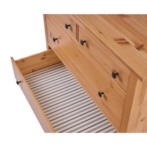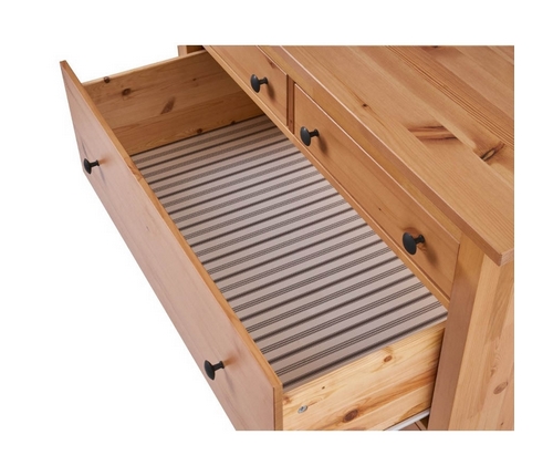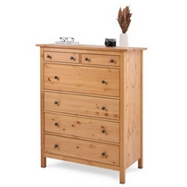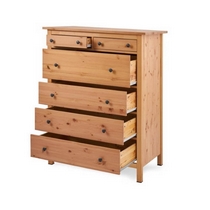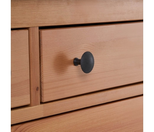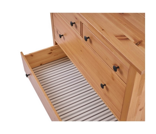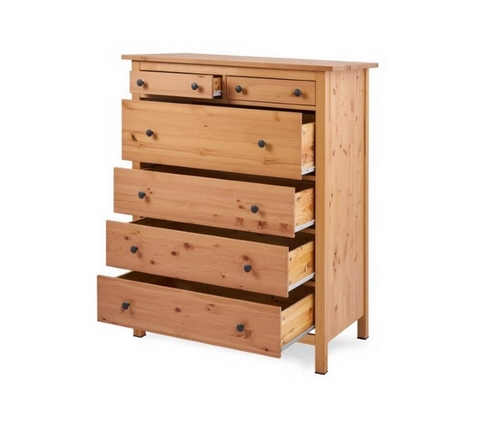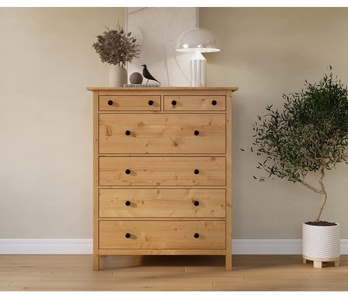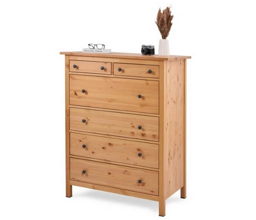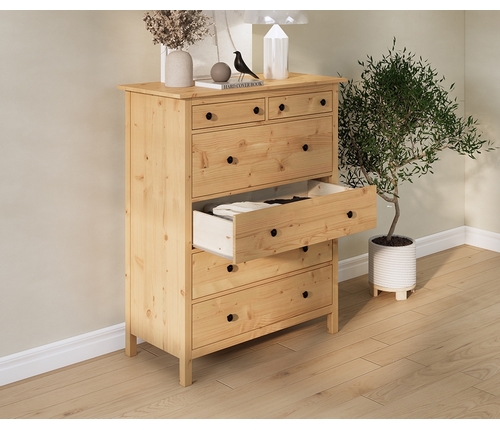 Комод оснащен двумя верхними маленькими и четырьмя вместительными выдвижными ящиками.