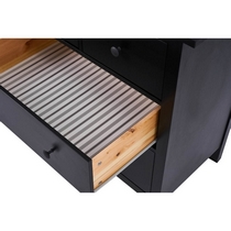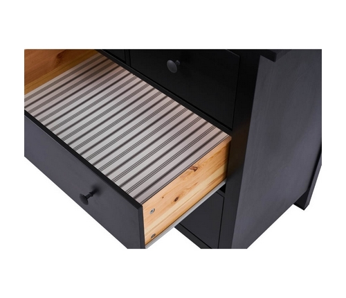 Комод оснащен четырьмя верхними маленькими и четырьмя большими выдвижными ящиками разной высоты.